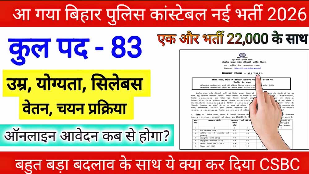 बिहार के युवाओं के लिए बड़ी खुशखबरी है. बिहार पुलिस की स्पेशल ब्रांच में सिपाही (कॉन्स्टेबल) के कुल 83 पदों पर भर्ती का ऐलान हो गया है. केंद्रीय चयन परिषद यानी CSBC ने इस भर्ती के लिए 29 जनवरी को आधिकारिक नोटिफिकेशन जारी कर दिया है. सामान्य प्रशासन विभाग, बिहार सरकार के आदेश के आधार पर यह भर्ती निकाली गई है.