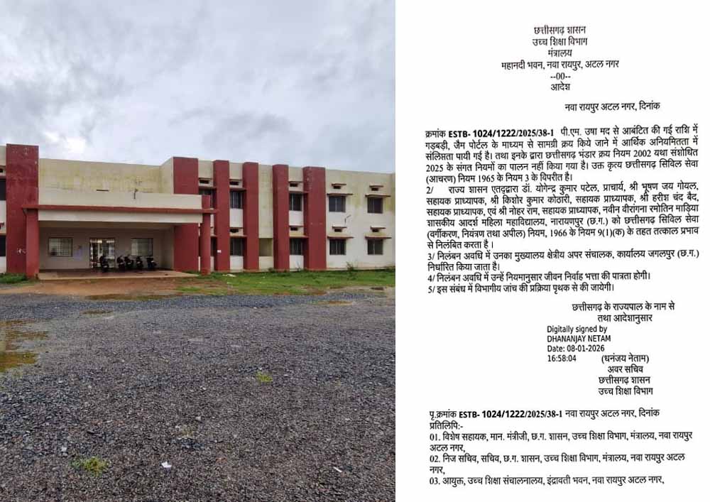 नारायणपुर महिला महाविद्यालय में पी.एम. उषा मद की राशि का दुरुपयोग, प्राचार्य सहित सहायक प्राध्यापक निलंबित